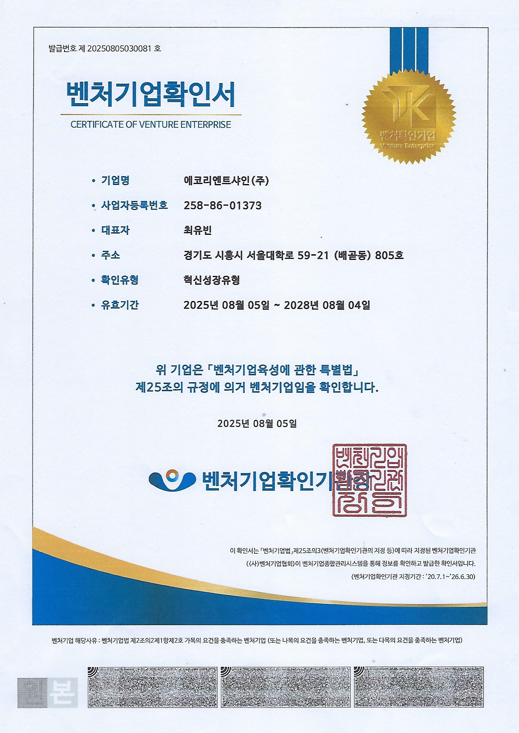 벤처기업지정 혁신성장 유형 (에코리엔트샤인 2025.8.5)