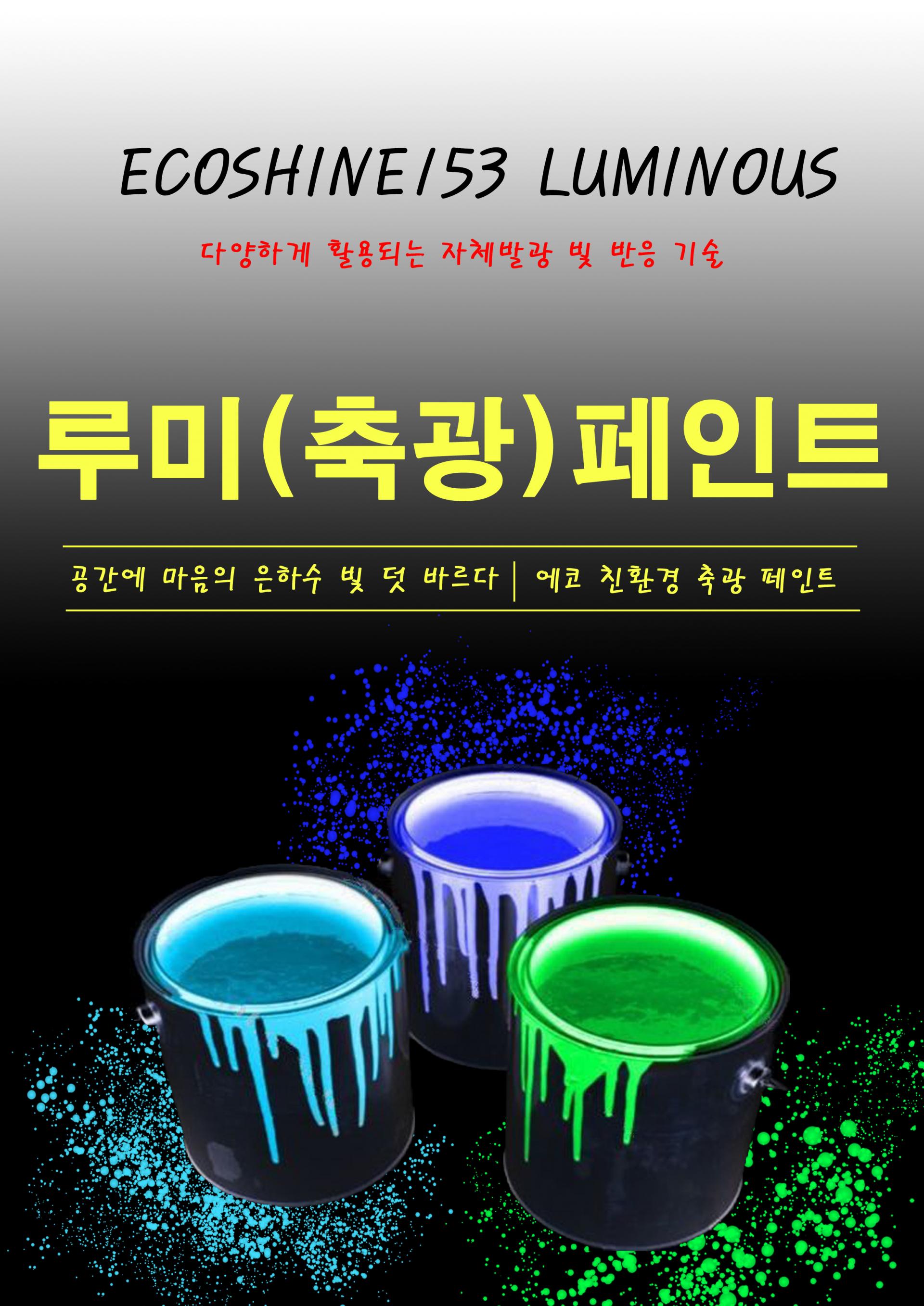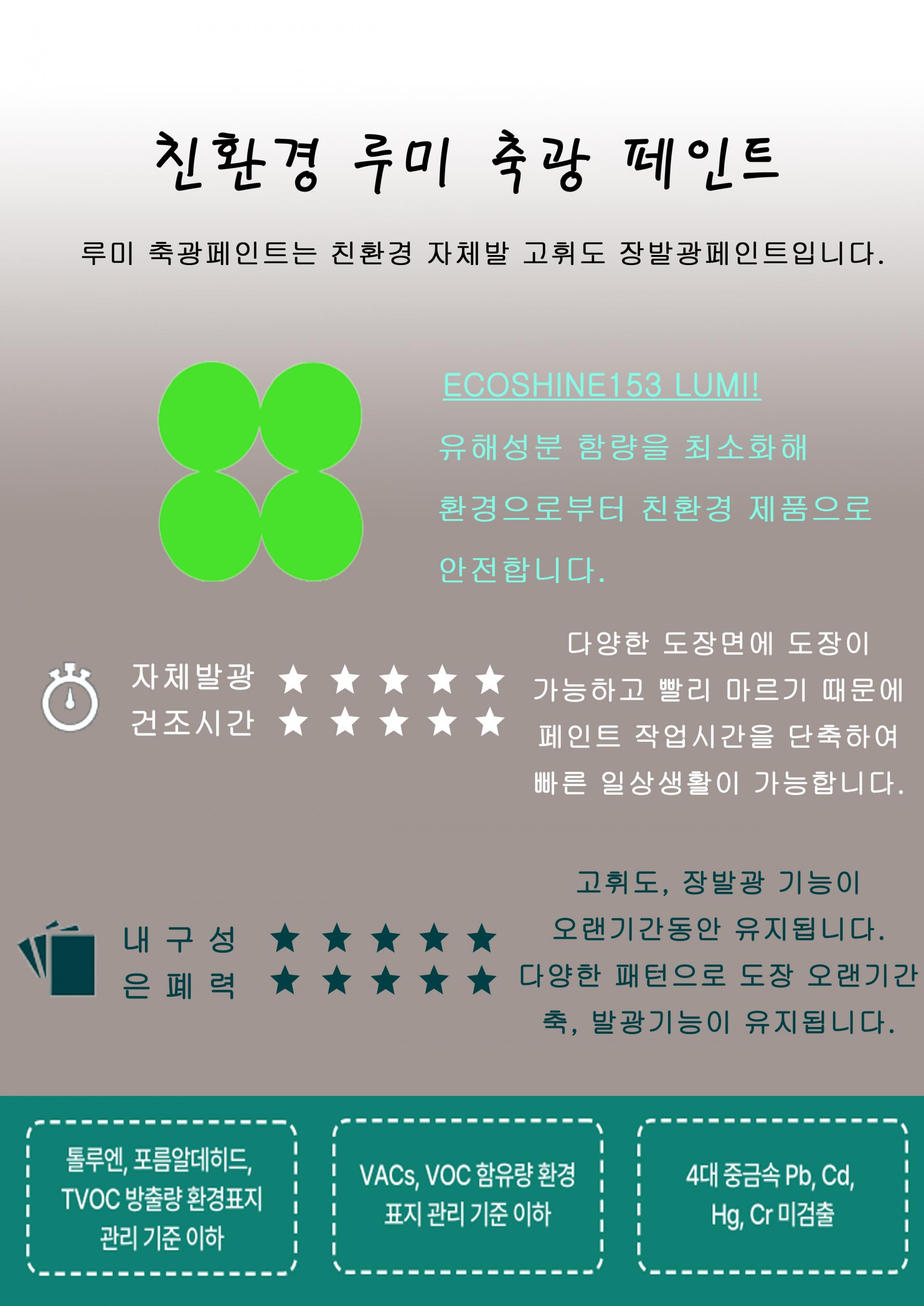 ECOSHINE153LUMINOUS 에코루미(축광)페인트 은 야간에 10시간 동안 조명을 밝힐 수 있는 최초의 축광 도로 페인트(클래스 G,KS S ISO 17398 표준) 입니다