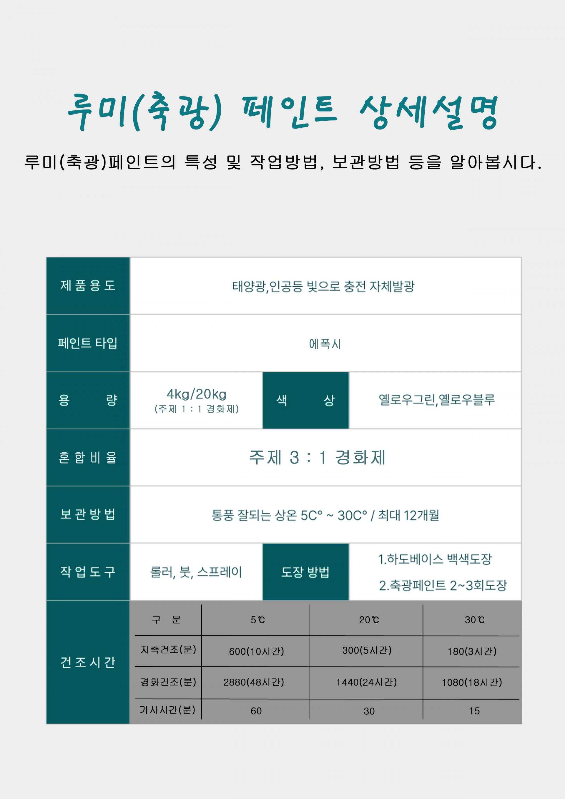 태양광 등 다양한 광원으로 빛을 흡수하고 저장하여 스스로 발광하며 에너지를 절약하고 장시간 고휘도를 유지하는 루미페인트